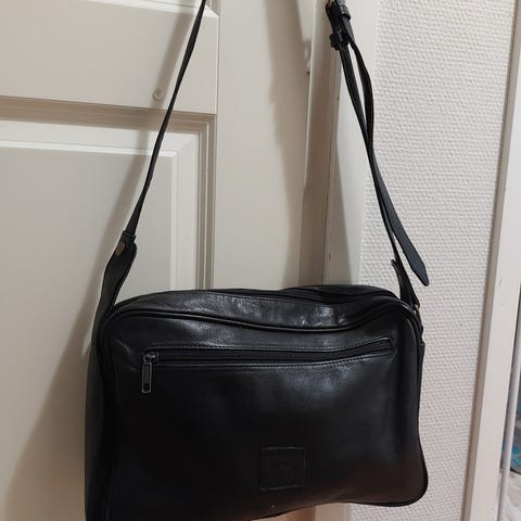 Musta Three bags merkkinen nahkalaukku. Korkeus 18cm, leveys 24cm, säädettävä, pitkä hihna. Suljetaan vetoketjulla, sisällä myös vetoketjutasku. Hyväkuntoinen.
