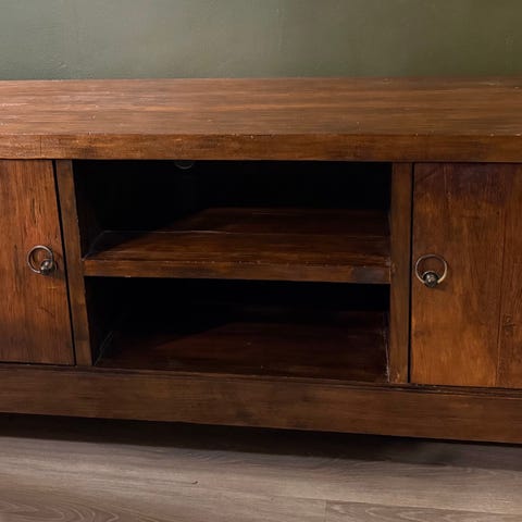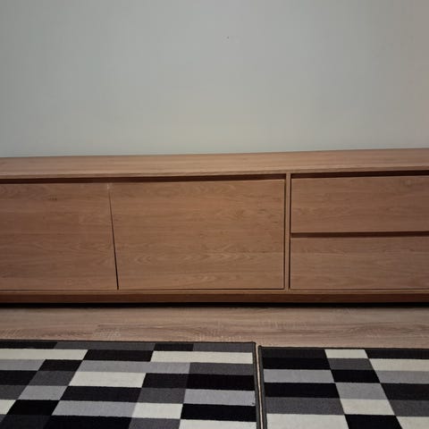 Boknäsin alunperin kirsikkapuun värinen ja sittemmin valkoiseksi maalattu tv-taso. Tämä Torin AI avustaja luulee sitä Ikean tuotteeksi, mutta ei ole vaan on täyttä puuta Boknäsin tyyliin.