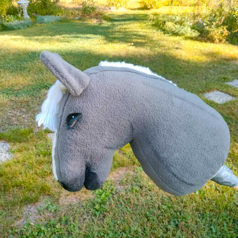 Myyntiin kuvan velboasta valmistettu keppihevonen.