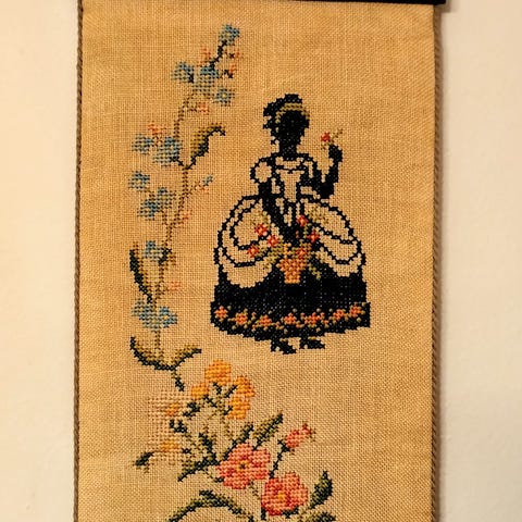 Hyväkuntoinen kaksipuolinen tekstiili seinävaate.