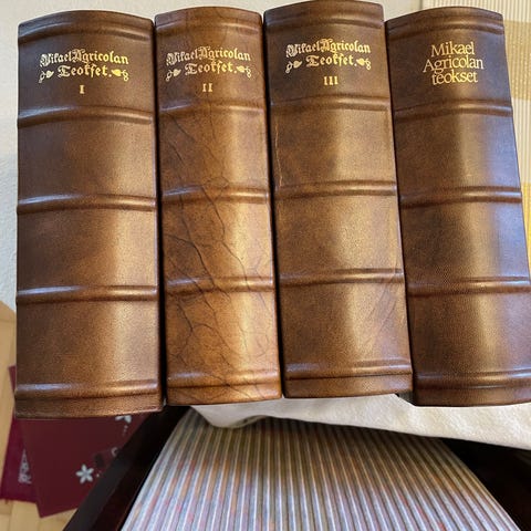 4-osainen näköispainos Mikael Agricolan tuotannosta. 3 kirjassa on Agricolan teokset. 4. osa on selvennysosa tulkitsemisen tueksi. Kunto moitteeton. Kulkeutuu myös Helsinkiin.