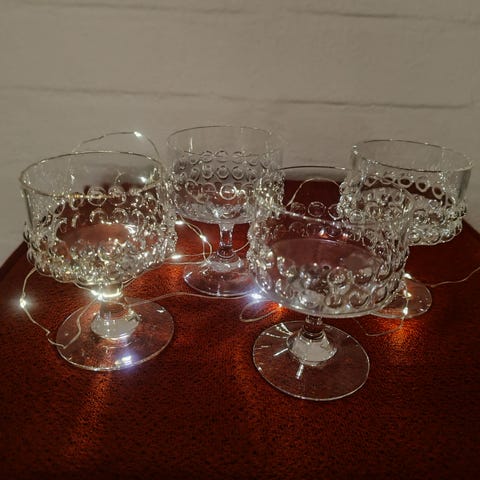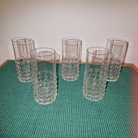 Kuusi kappaletta Nanny Stillin suunnittelemaa ja Riihimäen Lasin valmistamaa Grappo-juomalasia. Hienokuntoiset ja ehjät, kuin uudet.