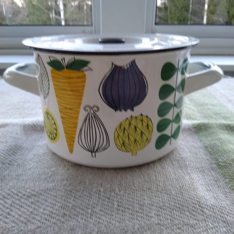 Finel Vegeta Kattila 2 litraa, valmistettu emaloidusta teräksestä. Ester Tomulan suunnittelema. Kattila sisältää kannen, joka on myös emaloitu. Käytössä näkyy käytön jälkiä ja kulumaa, kuten valokuvissa esitetty.