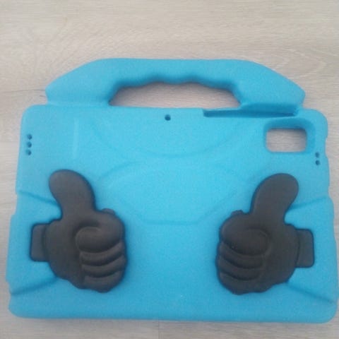 Hyvässä kunnossa. Saa pystyasentoon. Meillä olin Lenovon 24cmx15cm tabletti tuossa ja napakasti pysy paikallaan. Melko pehmeetä matetiaalia.
