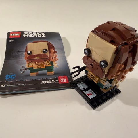 LEGO BrickHeadz Aquaman hahmo, joka on rakennussarja hahmon kokoamiseen. Sisältää Aquaman-teemaiset yksityiskohdat ja koostuu useista LEGO-palikoista. Sopii keräilyyn ja näyttelyyn.