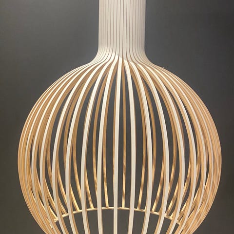 Seppo Kohon suunnittelema Owalo kattovalaisin. Yhdessä säleessä pieni kolhu, jota ei juurikaan huomaa (viimeinen kuva). Valaisin väriltään valkoinen. Asiallisia tarjouksia kuunnellaan.