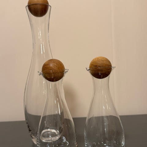 Elegantit öljy-/viinietikka-/salaattikastikepullot suupuhalletusta lasista tamminuppikorkilla. Pullot ovat Sagaformin Oval Oak -sarjaa. Ehjät, vain vähän olleet käytössä. Pullojen korkeus 20 cm korkkeineen. Upeat juhlapöydässä. Yhteishintaan. Ovh nettiliikkeessä parille 22-28€.
