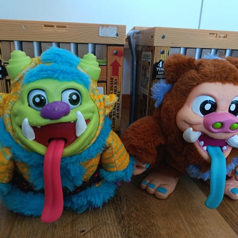 Kaksi hassua hahmoa, joita voi vetää kielestä ja kun päästää irti niin niistä kuuluu hauskoja ääniä kuten esim pieruja ja törmäyksiä. Mukana laatikko jonka voi muuttaa maalitauluksi.