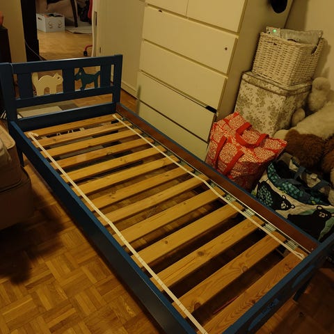 Jatkettava lasten sänky. Toisella puolella jälkiä, jotka jäänyt tarroista. Toisella puolella ei mitään jälkiä. Naantalissa