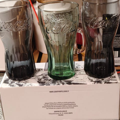 3 kpl Coca-Cola laseja, yksi täysin käyttämätön pakkauksessa, muut erittäin hyvässä kunnossa. Värit kirkas 1 kpl, sininen 1 kpl ja Georgia green 1 kpl.
