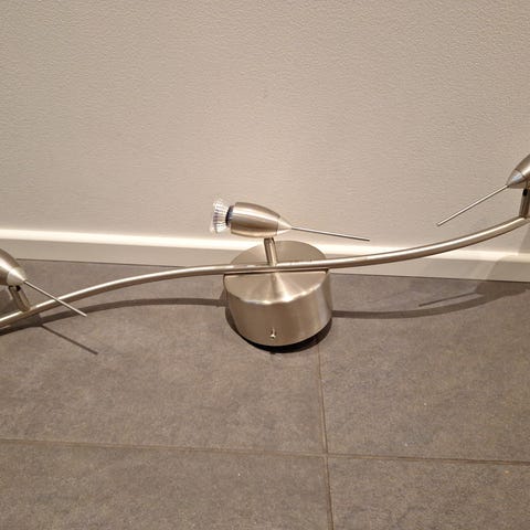 Valkoinen led valaisin, lamput mukaan. Sokeripalakiinnitys. 3 X GU10, max 50 W. Värilämpötilaa nyt en tarkkaan tiedä mut on lämmin valkoinen.