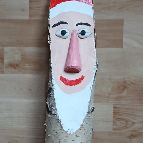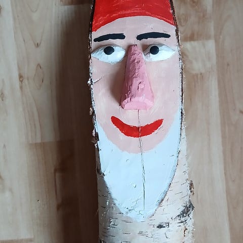 Halkaisija 9cm, korkeus 43,5cm. Tuohi irtoaa paikoittain, takapuolelta. Myynnissä muitakin tonttuja.