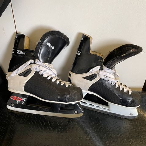 Myynnissä CCM Tacks AS 550 jääkiekkoluistimet, koko 40,5 (US 6). Teränpitimissä näkyy jälkiä kiekon osumisesta, mutta ei huononna kuntoa juuri lainkaan. Muuten luistimet ovat erinomaisessa kunnossa. Ollut vähällä käytöllä pari talvea. Nauhat on vaihdettu itse mustiin vahanauhoihin.