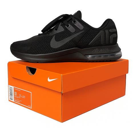 Nike Air Max Alpha Trainer 6 -kengän musta versio, jossa on vaaleansinisiä yksityiskohtia ja näkyvä Max Air -yksikkö kannassa