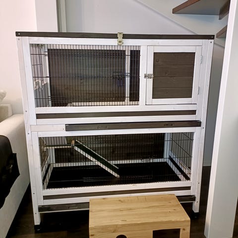 Häkissä on ehjä pohja ja kaksi ehjää toisen ja kolmannen kerroksen pohjaa, eli kolme ehjää pohjaa. Kaksi on rikki ja toista on korjattu. Toisessa rikkinäisestä on kulma rikki ja taitava sen korjaa, on kyllä pohjia käytetty paljon. Saattaa olla, että yksi ruokakuppi on hukassa. Muovisissa rampeissa on ollut ruuveilla kiinni "katokset" jotka on nyt kastuneet ja pitää ruuvata pois.