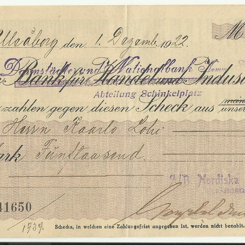 Suomen Kymmenen Markan Shekki 1918 Vapaussodan aikainen No 221224