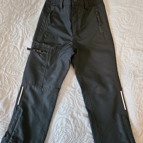 Kuorihousut, koko 116. Etupuolen heijastimessa kulumaa ja toisessa polvessa pientä pehmentymää, muuten hyvässä kunnossa. Nouto / Tori-diili
