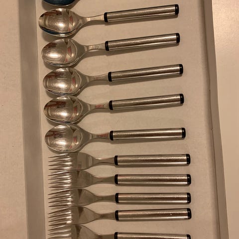 Kaksi kuuden kahvilusikan käyttämätöntä sarjaa, molemmissa sinetit paikoillaan. Toisessa kannessa naarmu ja toinen ehyt. Ehjä laatikko 100e ja naarmunen 90e