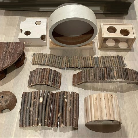 Huom. Kaikki tavarat on liotettu, pesty hajusteettomalla tiskiaineella, huuhdeltu ja kuivatettu huolellisesti, mutta luonnollisesti puisiin mökkeihin ja erityisesti saviruukkuun on pinttynyt hajua. Suosittelenkin kääntelemään ja kuivattelemaan niitä välillä käytössä, jos hamsteri valitsee yhden paikan vessakseen, jotta kosteus pääsee haihtumaan ja hajut vähenevät.