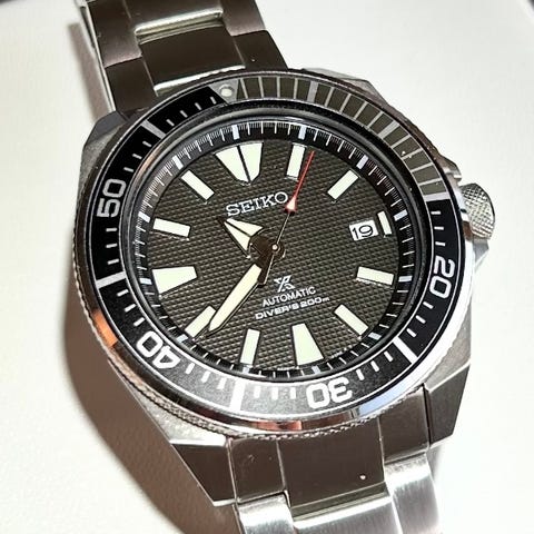 Myyntiin jo harvinaisempi Seikon jykevä suklari gunmetal-värityksellä. Käytön jälkiä bezelin sisäkehällä ja lasissa kevyt naarmu, muuten hienossa kunnossa. Uusi kapasitaattori vaihdettu, jolla käy ja pitää aikaa taas vuosia. Kellossa kiinni musta käyttämätön FKM-kumi. Originaaliranneke mukaan, jossa enemmän naarmua.