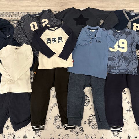 Ns. kalsaripaita ja -housut (kuminauha ajan saatossa huonontunut), tummansininen neuletakki ja neuleliivi.