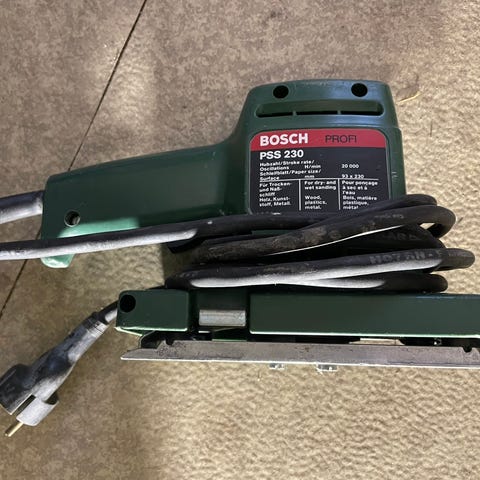 Bosch PSM 100 A hiomakone, mukana useita hiomapaperiliuskoja eri karkeuksilla ja alkuperäinen käyttöohje. Hiomakone soveltuu puun, metallin ja muiden materiaalien hiontaan. Laite toimitetaan säilytyslaatikossa.
