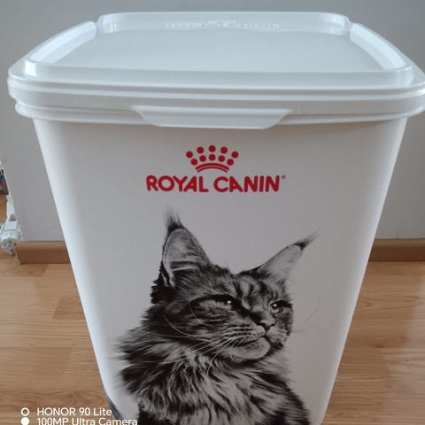 Reilun kokoinen ruoansäilytysastia koiralle. Korkeus noin 32 cm, leveys noin 40 cm leveimmästä kohtaa mitattuna