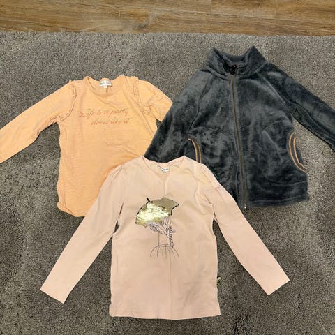Täysin käyttämättömät uudet farkut, canvas-housut, 3 trikoopaitaa ja paitapusero.