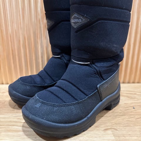 Kahdella lapsella käytössä olleet Kuoma talvisaappaat. Kaikin puolin ehjät kengät. Heijastavat rataskuviot. Kuviointi paikoin kulunut ja kärjissä kulumaa. Pesty edellisen käyttäjän jälkeen tuoksutomalla pesuaineella.