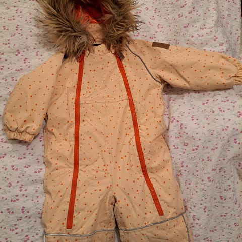 Kirkkaan punainen, ihana ja lämmin toppahaalari. Todella siisti ja ehjä, ainoa miinus todella pieni kuluma kankaassa ja heijastimissa takapuolen ja polvien kohdalla. Jalkalenksut puuttuvat.