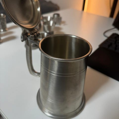 Vanha englantilainen tai norjalainen tinatuoppi. Sisältä vaatii puhdistusta, muuten ihan hieno.