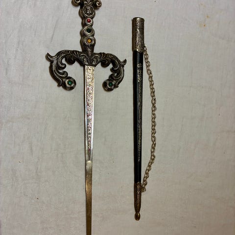 Pituus 100 cm. Kotelo hiukan kulunut, miekka itsessään omaan silmään hyväkuntoinen. Vain nouto
