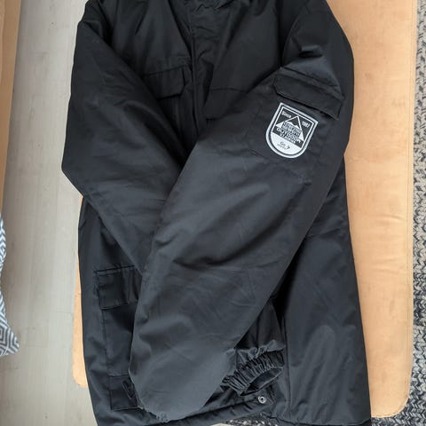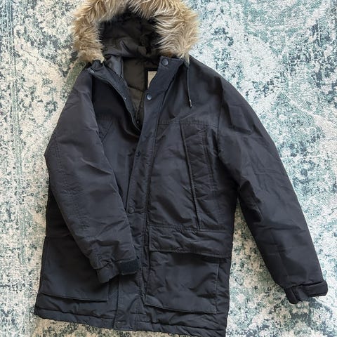 Miesten musta pitkä parkatakki, käyttämätön. Takissa vyötärössä kiritysnauha ja takin kummallakin puolella povitaskut. Takissa painonapilliset taskut, vetoketju sekä painonapit ja kiinteä huppu. Takki on lämmin ja kohtuullisen painava. Takki on sovitettavissa Pohjois-Espoossa.