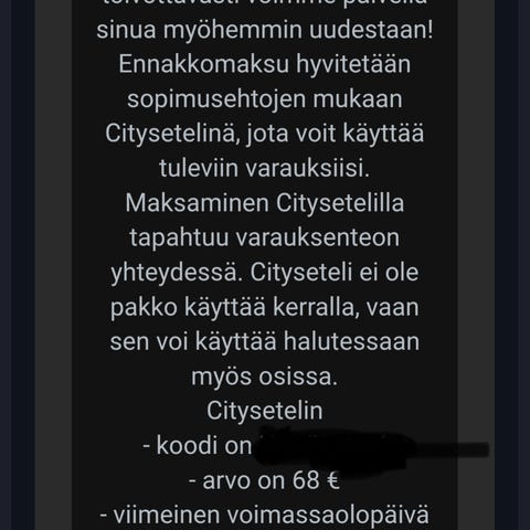 Myydään 130€ arvoinen cityseteli, joka saatiin muuttoauton peruutuksesta. Voi käyttää paku ovelle varauksiin ja cityvaraston maksuihin. Voimassa 27.1.2027.