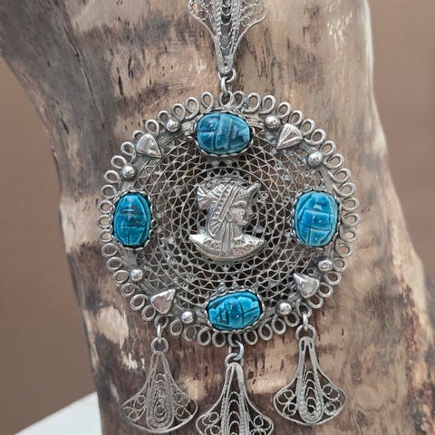 Näyttävä ja suuri vintage-tyylinen kaulakoru, jossa kaunis pitsimäinen medaljonkiriipus. Näyttävä koru, joka sopii hyvin arkeen ja juhlaan. Koru on hyvässä käytetyssä kunnossa, ketju ja riipus metalliseosta