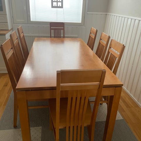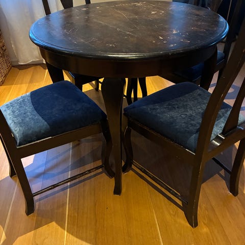 Myydään tarpeettomana hyväkuntoinen, antiikkinen tummanruskea pöytä ja neljä tuolia.