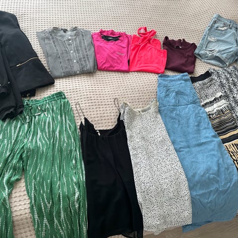 Iso setti vaatteita: hameita, paitoja, mekkoja, farkut... Merkkeinä mm. H&M, Nanso, BikBok yms.