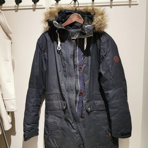 Hyväkuntoinen tummansininen pidempi talvitakki. Karvareunus hupussa irroitettavissa. Kiristys vyötäröllä. Vuoressa joku jälki, jonka kuvatessa huomasin, ollut ehkä jo minulle tullessa. Mittoja: kai-kai 54,5 ja olka-helma 78cm. Ripustuslenkki rikki.