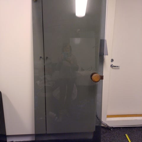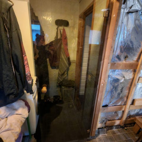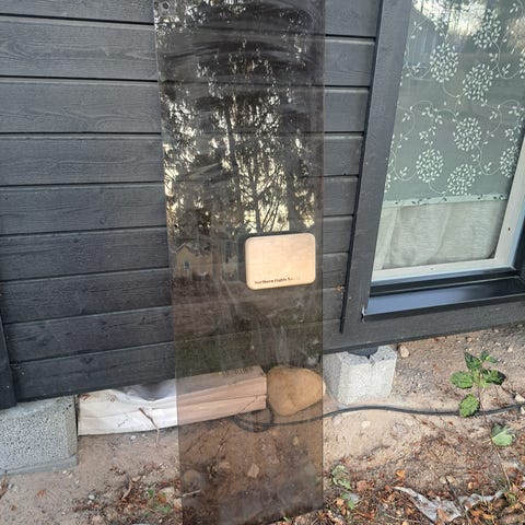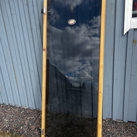 Puinen saunanovi, jossa on lasiosat ja käsin muotoillut puiset kahvat. Saunanovi koostuu useammasta lasikentästä ja on valmistettu luonnonvärisestä puusta. Poistettu remontin takia.