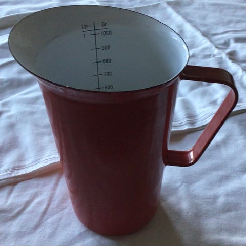 Finel keräily astia ,15x15 punaista emalia reunassa kolhuraapaisua
