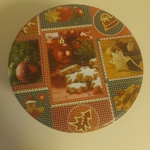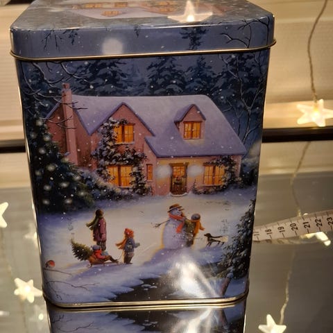 Punasävyinen kaunis jouluaiheinen peltirasia.