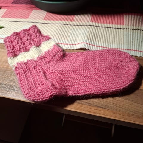 Käsintehdyt villasukat, joissa on ruskea pohjaväri ja raidallinen kuviointi mustalla ja harmaalla. Sukat ovat kokoa noin 30 ja ne sopivat kylmien säiden lämmikkeeksi.