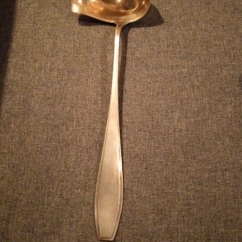 Kaksi teräksistä jälkiruokakauhaa, joissa on kultaista pintaa. Yksi kauha on pakattu muoviin, toinen näkyy kokonaan. Kauhat sopivat ruoan annosteluun tai tarjoiluun. Kauhat on istettu Dubaista.