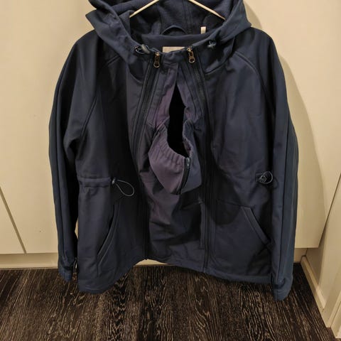 Hyväkuntoinen mamalilan kantotakki / äitiystakki. Hupullisen kantopaneelin saa selkään ja eteen, myös raskausvatsalle paneeli tuomaan lisätilaa.