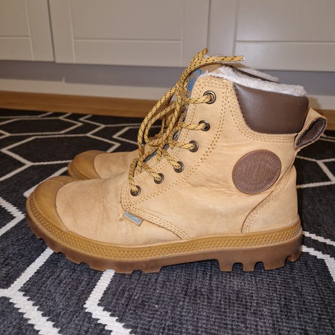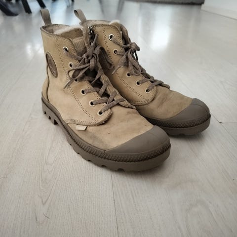 Vaalean ruskeat Palladiumin nahkaiset talvinilkkurit. Karvavuori. Kärjestä ihan vähän reuna repsottaa (viimeinen kuva). Sisäpuolelta kärjestä yläpuolelta vähän karva kulunutta.