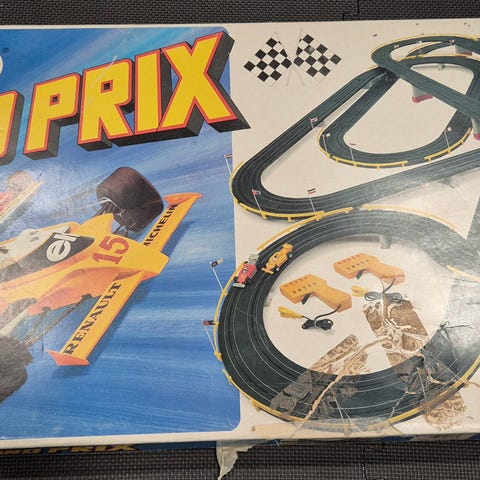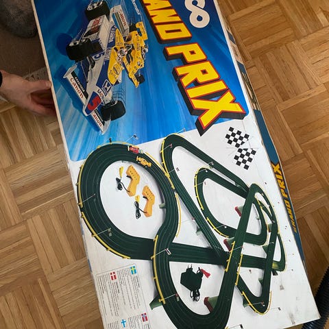 Autorata ja kierroslaskuri. Toisen auton takailmanohjain on hävinnyt, ja toisen on liimattu takaisin paikoilleen. Kaikki osat muutoin tallella ja ehjiä. Kierroslaskurissabasetettavissa korkeintaan 25 kierrosta.