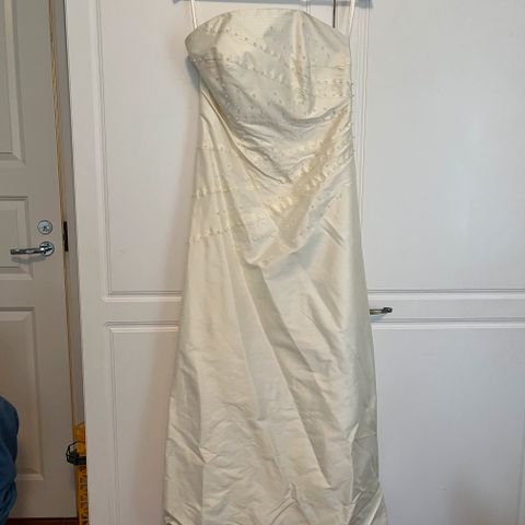 Kaunis suoralinjainen juhlapuku, koko S. Mekossa on koristeltu yläosa ja pieni rusetti. Materiaali satiini ja sifonki