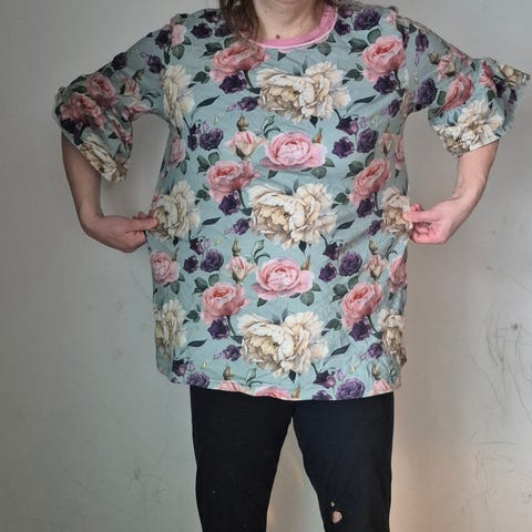 Kevyt ja vähän läpinäkyvän tyylinen paita. Kivan viileä materiaali iholla. Rypytetty kaula-aukko ja hihat. Venyvä. Kokolappu irti, joten kainalo x kainalo mitta on: 61 cm x 2 = 122 cm. Joustaa tästä.
