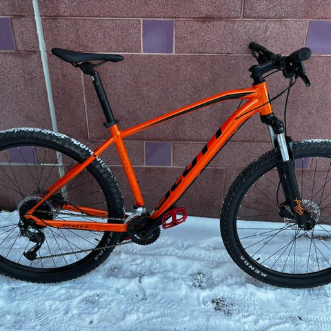 Scott maastopyörä 29 L, punainen väri. Soveltuu maastopyöräilyyn ja vaihteleviin maastoihin.
