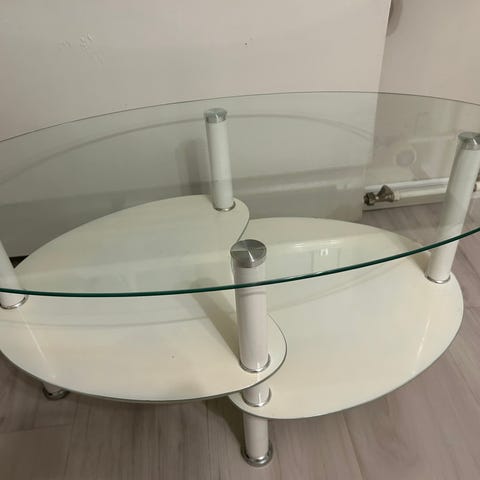 Hieno ja jämerä sohvapöytä. Alataso on mennyt rikki. Pinnassa pieniä naarmuja mitä ei 2m päästä katsoen erota.